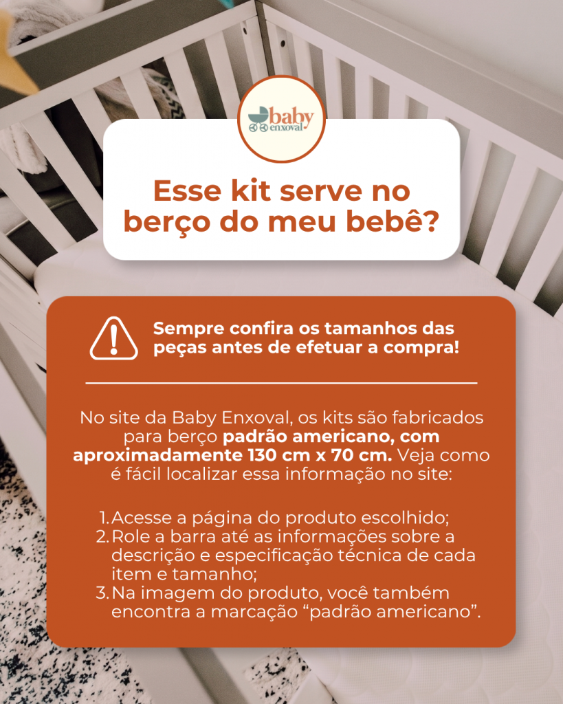 Os tamanhos dos itens que compõem o kit berço podem variar, por isso é muito importante que você, antes de efetuar uma compra, verifique o tamanho adequado. No site da Baby Enxoval, os kits são fabricados para berço padrão americano, com aproximadamente 130 cm x 70 cm. Veja como é fácil localizar essa informação no site!