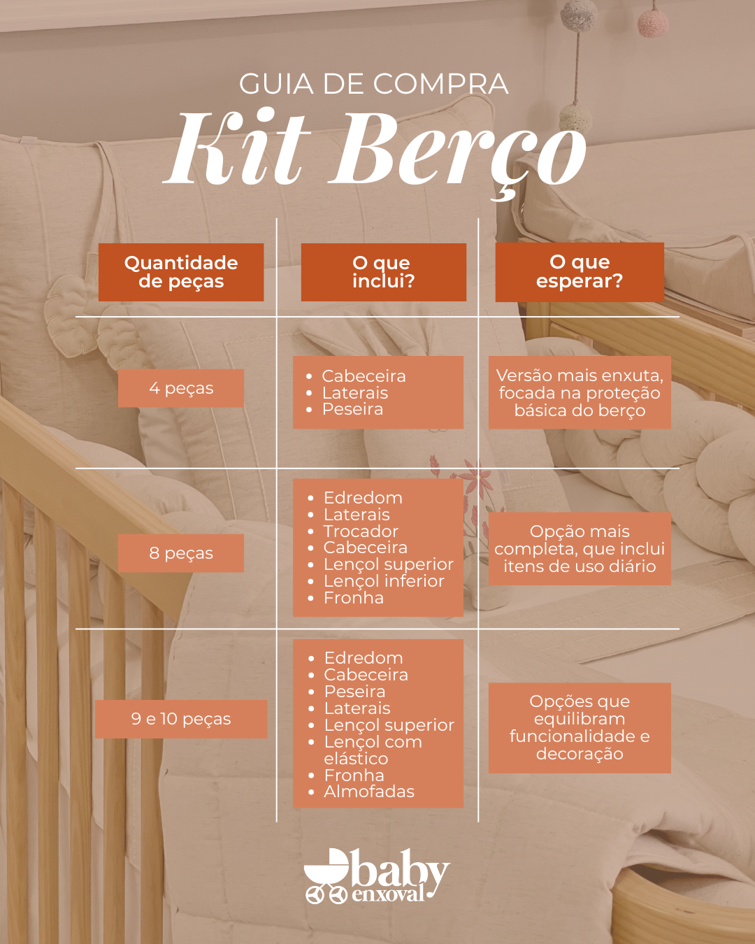 A composição do kit berço pode variar bastante, mas normalmente inclui cabeceira e peseira, protetores laterais, lençol, fronha e edredom. No site da Baby Enxoval é possÃvel encontrar opções a partir de 4 peças. Confira abaixo algumas das composições disponÃveis!